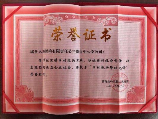近日,瑞众保险山东分公司临沂中支荣获莒南县岭泉镇人民政府授予的“乡村振兴帮扶先锋”称号。这份荣誉既是对临沂中支帮扶成效的高度认可,更是践行“服务国之大者 守护美好生活”企业使命的生动注脚。